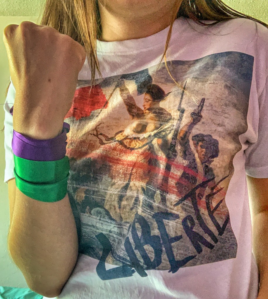 Llegó la hora y comencé a alistarme. Por supuesto, ya tenía pensada mi vestimenta. En momentos importantes siempre busco portar símbolos que me recuerden ese día, cada color, cada sentir, cada aroma y cada sonido (un poco de mi lado cursi). Esta vez, les tocó a mis calcetines con la icónica imagen de Rosie the Riveter con la leyenda “We Can Do It!”, también fue momento de estrenar mi playera con la pintura de “La Libertad guiando al pueblo” del artista Eugène Delacroix. No pudo faltar un listón morado y uno verde, por que sí, estoy a favor de la legalización del aborto (ya hablaremos de esto en otra entrada). Para finalizar, siguiendo las indicaciones, anoté en mi brazo mi nombre completo y los datos del contacto al que podían buscar en caso de que me pasara algo, y aquí, tuve que hacer una pausa por unos minutos.